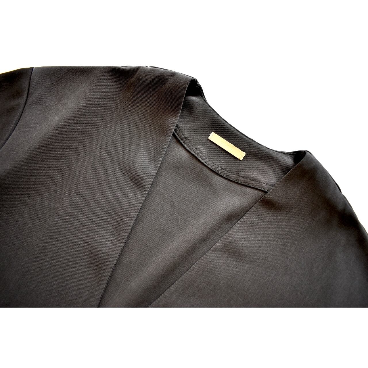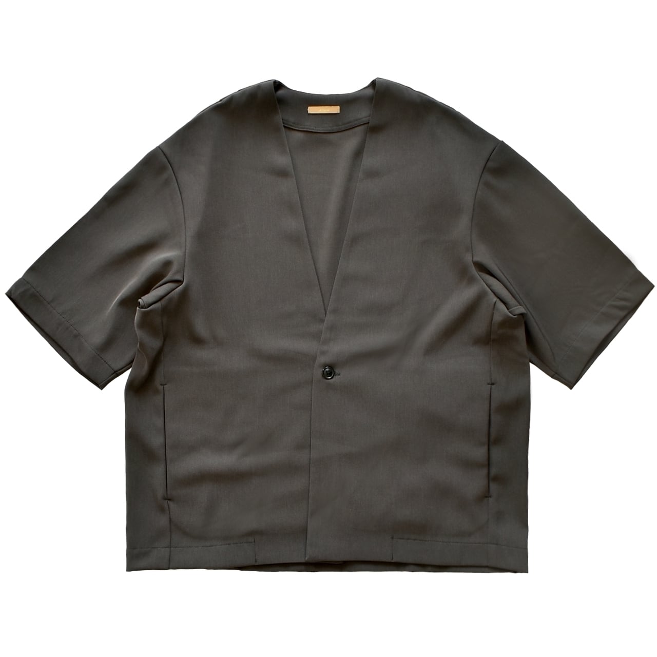 ミニマルなノーカラーデザインは、インナーを選ばず様々なスタイルに馴染みます。ゆったりとした身幅とショートスリーブが、リラックス感のあるシルエットを演出しつつも、上品な大人の雰囲気を醸し出します。
