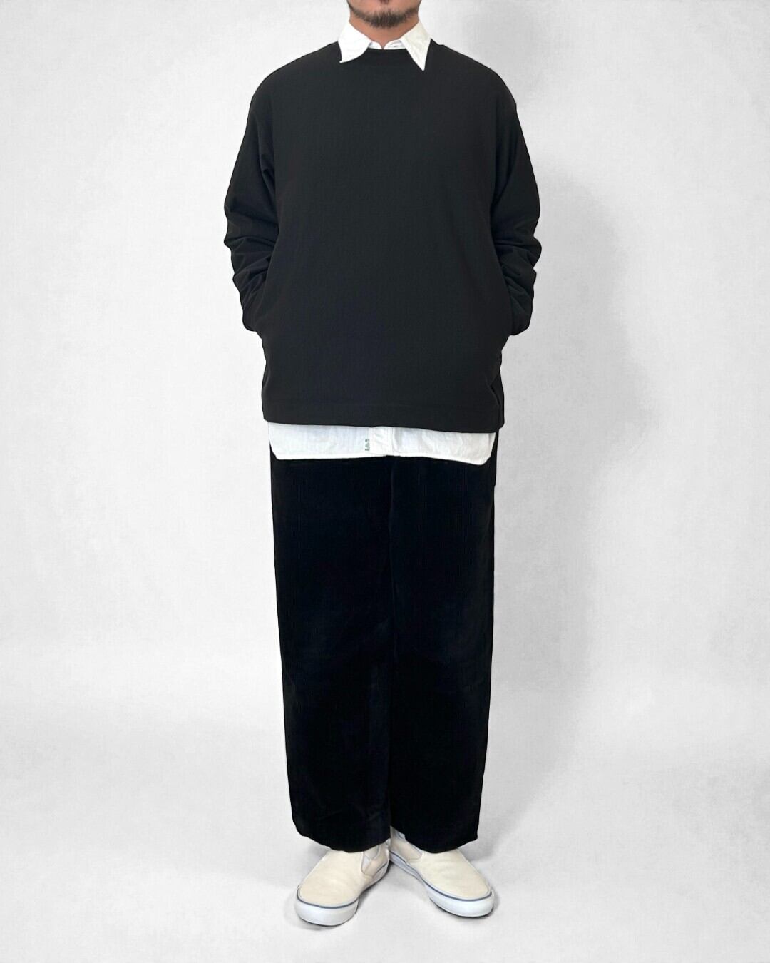 ボトムスには、ゆったりとしたシルエットのコーデュロイパンツを合わせることで、温かみのある素材感とリラックス感を演出。全体をダークトーンで統一しつつ、足元は明るいスニーカーで抜け感を加えることで、重くなりすぎないバランスで組んでみました。