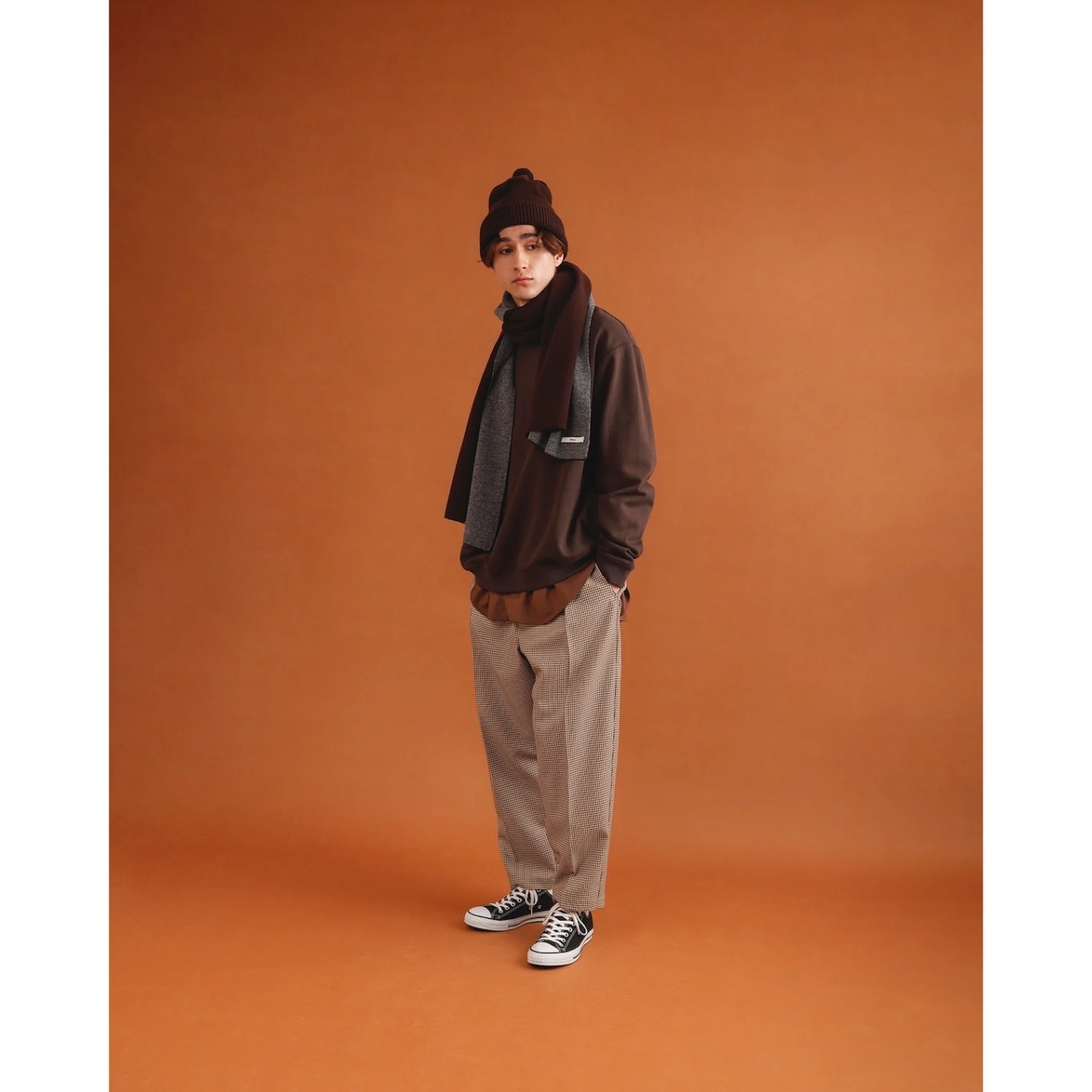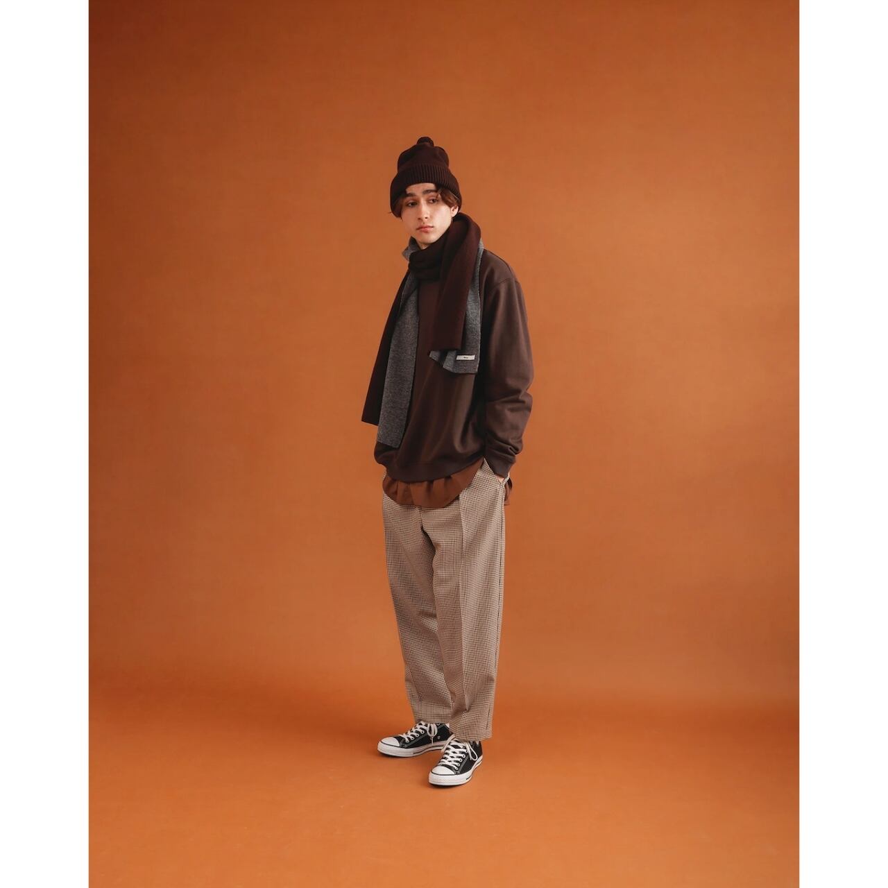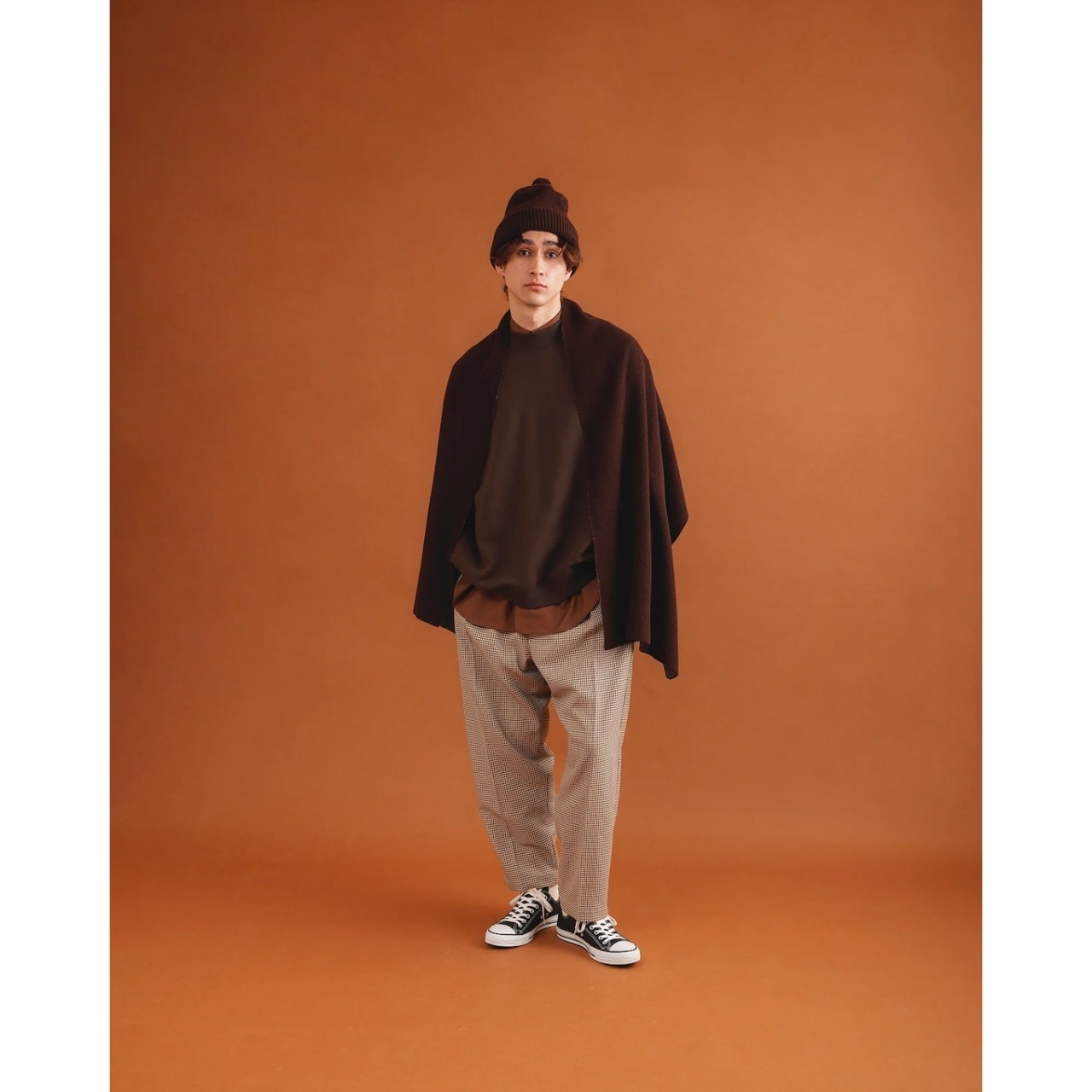 環境に配慮された上質なノンミュールジングウールを使用し、しなやかな肌触りと美しい落ち感を実現。繊細なチェック柄が、装いに奥行きと知的な印象をプラスします。