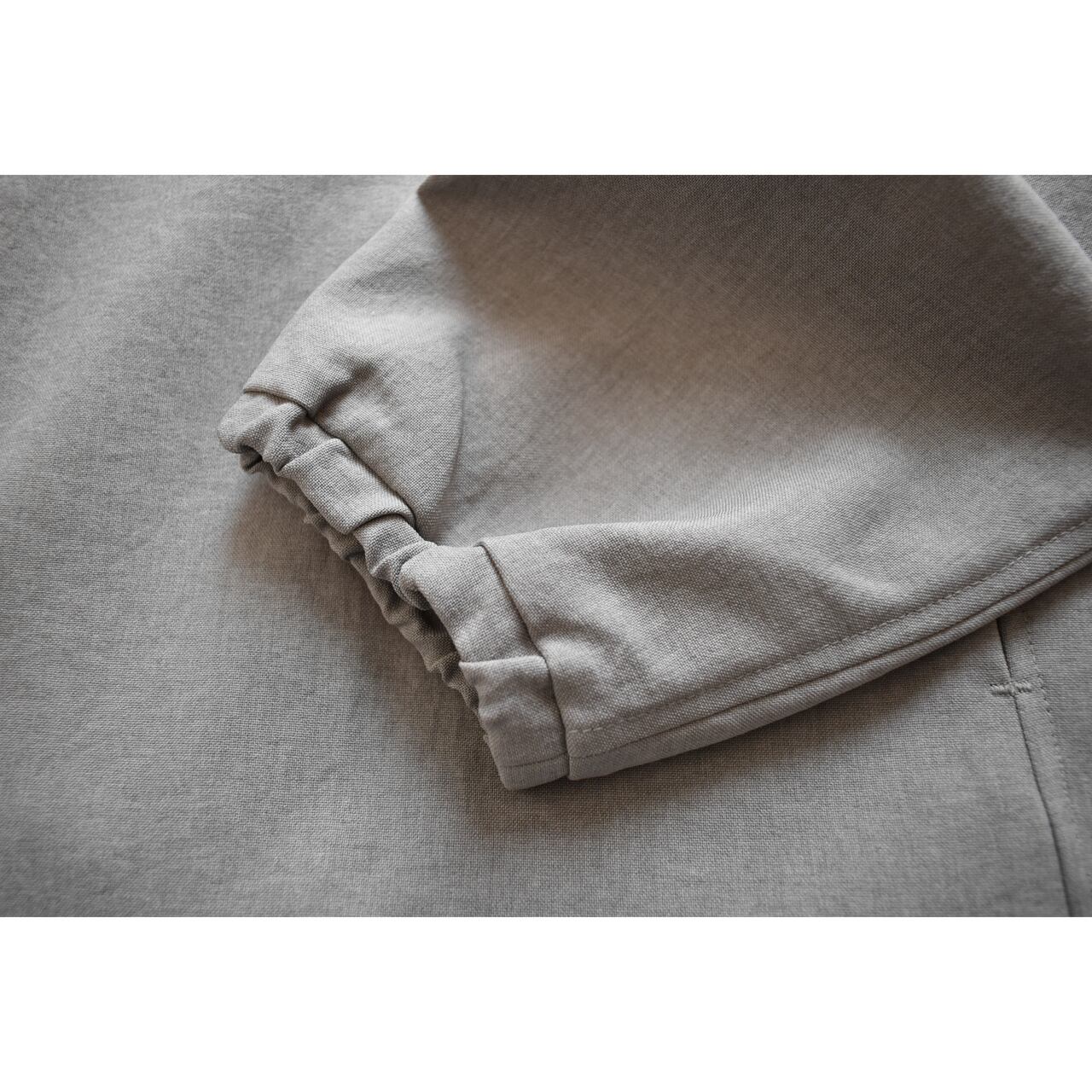 裏地を省いた一重の「軽量仕立て」のため、着心地はまるでシャツのように軽やかです。しかし、首元のスッキリしたノーカラーデザインが、カーディガンよりも端正で、ジャケットよりも気負わない絶妙な立ち姿を演出します。