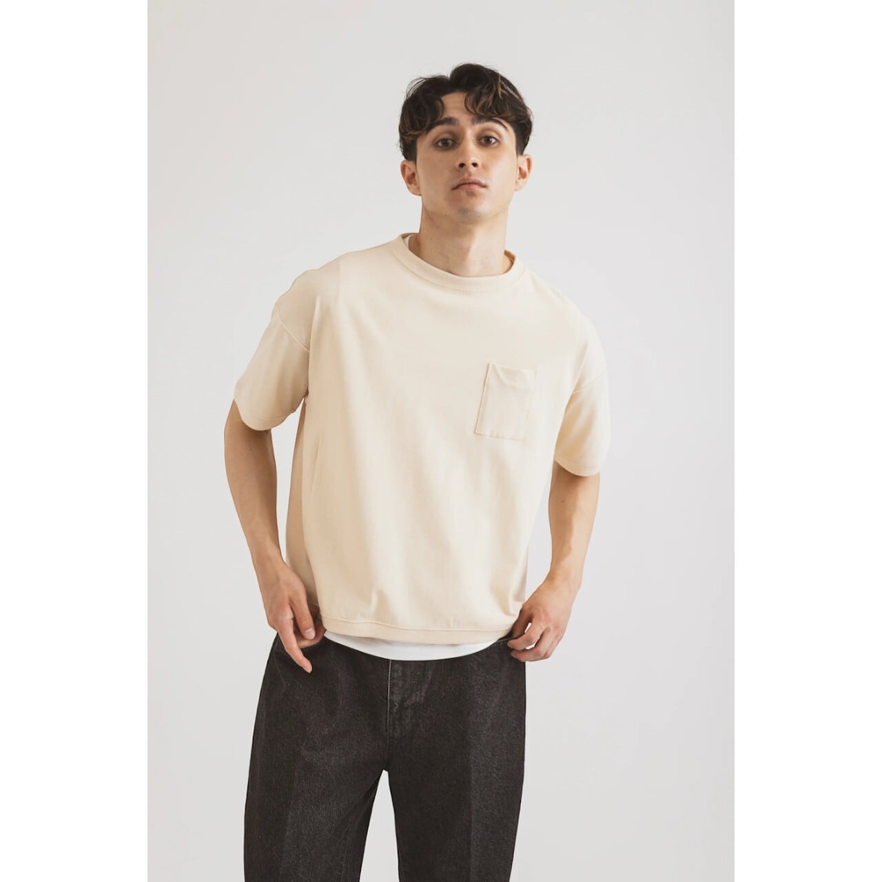 胸元に配された極小のスクエアポケットが、洗練されたデザインの中に大人の遊び心を感じさせる、まさに日常の新しい基準となる一着です。